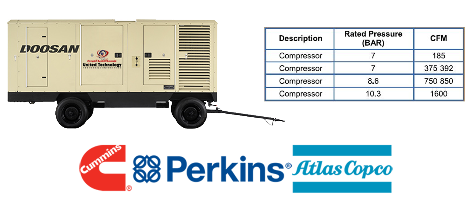We offer a full choice of electric, diesel and 100% oil free compressors up to 1500 cfm, along with desiccant air dryers which, when used in conjunction with oil free compressors, can give 750 to 1500 cfm of dry air.